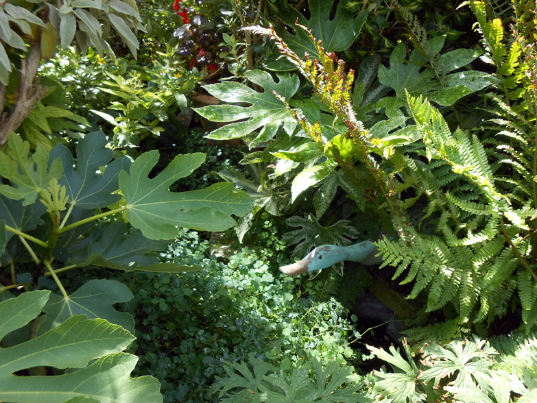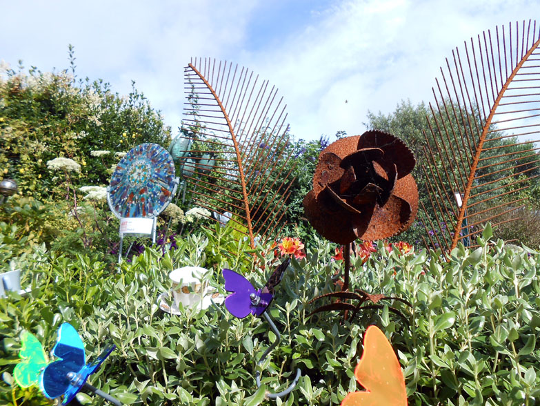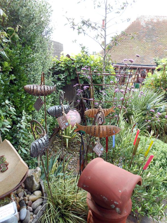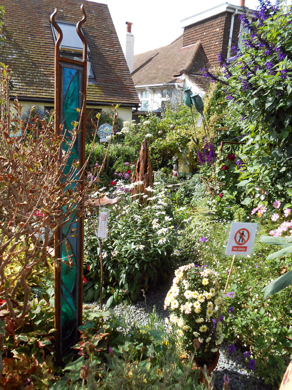 Anyway, enough preamble. I will now take you around the garden, the first picture being of the front garden and the others of the main garden out back. You will notice some pieces of artwork, as well as various curiosities among the plants, contributing to the garden’s sea theme. The ones with price tickets on them are the work of artists, while the other ones belong to Geoff. There is also a wooden shed that was built for Geoff’s late father, and the last picture is not a real door but a folly door.