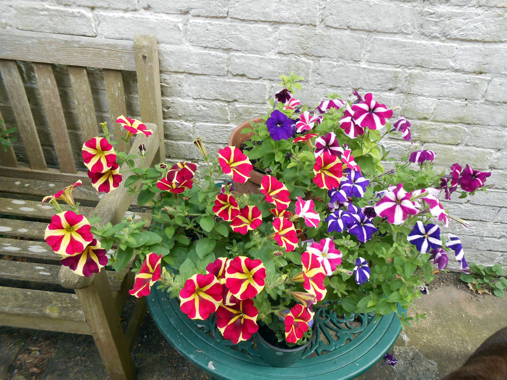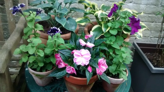 Here’s how some of my petunias, busy lizzies, and hostas looked a few days ago, and there are many more pots of them happily dotted around the garden with only the odd hole in their leaves…